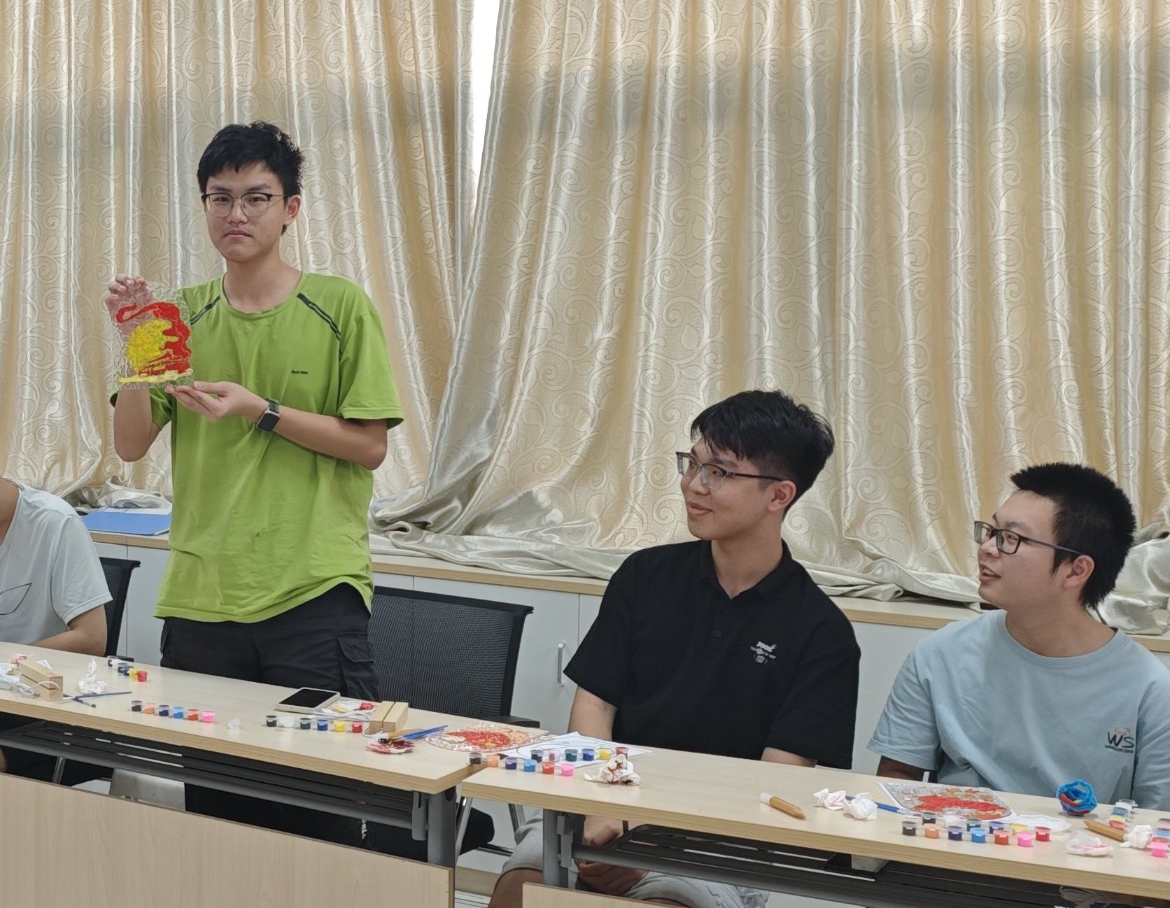 同学们结合自己所绘制的作品分享活动心得。张诗瑶表示,将“掐丝珐琅”这一传统非遗手工艺术与爱国主义教育紧密融合,不仅让大家沉浸在非遗文化的独特魅力中,还在无形之中融入了对祖国的无限祝福与热爱。一件件作品成为了传递爱国情感的生动载体,在这个特殊的时刻,同学们共同祝愿伟大的祖国繁荣昌盛、国泰民安。