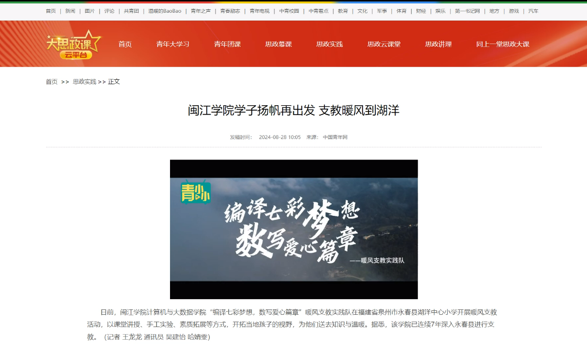 本次暑期社会实践,百合小说 各实践团队脚踏实地、圆满完成实践活动并形成优异的实践成果。同时我院师生积极开展实践宣传,多个实践队相关实践纪实得到中新网、中国周刊网、新福建、中国日报网、海峡网、中国青年网等各类媒体的关注、报道,其中国家级报道13篇,省级媒体报道5篇,其他级别媒体报道90余篇,起到了良好的宣传推广效果,展现了计数学院学子的风采,也提高了百合小说 的社会影响力和美誉度。可喜可贺的是,“编译七彩梦想,数写爱心篇章”暖风支教实践团队的支教视频被共青团中央大思政课云平台《思政实践》专栏所收录。此殊荣非但彰显了对暖风支教队伍的深切认可与崇高赞誉,更如同璀璨星辰,照亮了团队每位成员不懈耕耘、默默奉献的成长轨迹,成为其辛勤汗水最为闪耀的徽章,彰显着责任与担当的熠熠光辉。
