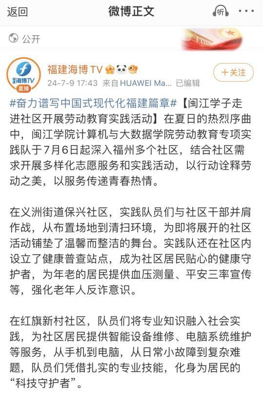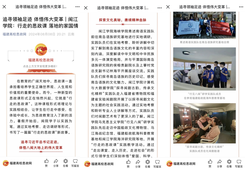 学院聚焦“‘行见八闽’大思政课研学实践”推普助力乡村振兴”“党史学习教育及理论宣讲”“扎根八闽振兴乡村”“暖风服务学习”“就业见习调研”“国情民生观察”等12个实践专项深入基层一线开展实践活动,积极引导青年学生践行“知行合一”的理念,深刻领悟中国式现代化的丰富内涵与深远意义,鼓励他们将个人理想与融入国家发展大局,以实际行动响应时代号召,为推进中国式现代化进程贡献青春力量。