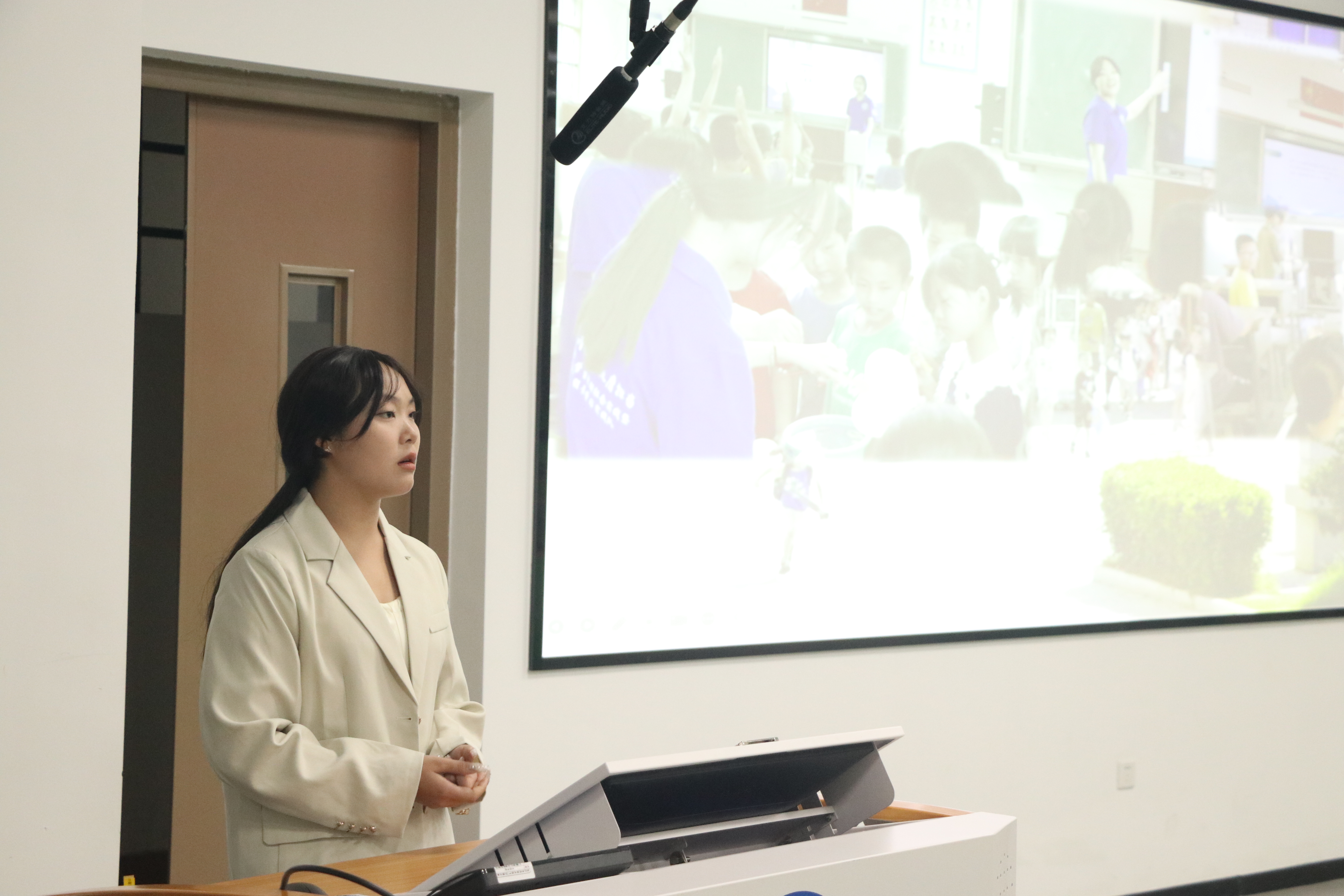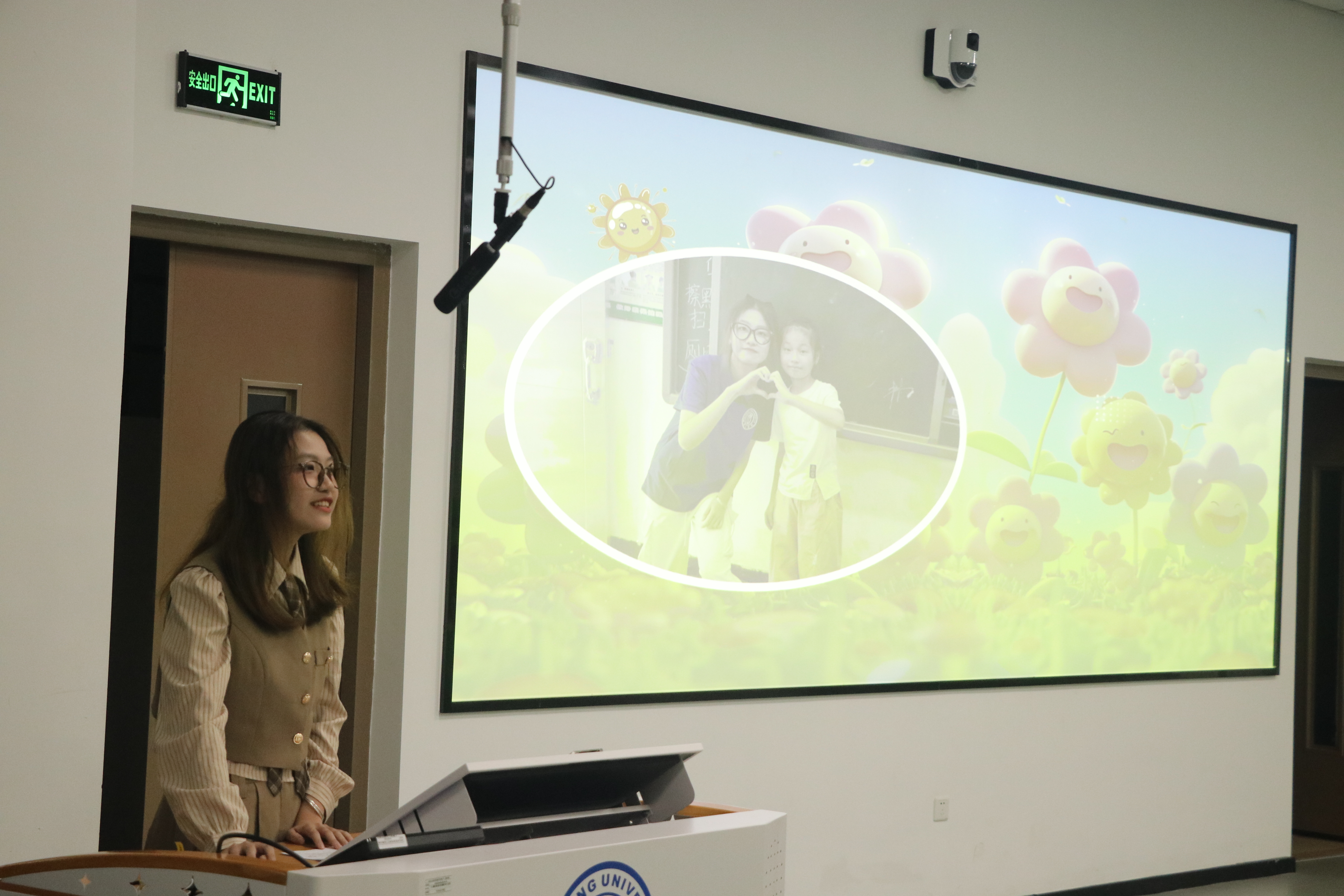 2023级数学与应用数学师范专业金奕飞同学系统地介绍了湖洋中心小学的支教课程和支教队员。课堂上,“音乐律动”、“模拟商店”、“诗词接龙”等课程让孩子们在轻松愉快的氛围中感受到了音乐、数学与语文的魅力,而“制作发电机”、“小投石机”、“牛奶动画”、“棍子跳舞”和“软件编程”等课程,则让孩子们化身小小科学家和程序员,亲手探索奇妙的科学世界。随着照片一张张地放出,孩子们纯真的笑脸也逐渐展现在我们眼前,每个孩子的故事也都深深触动了我们的内心。在艰苦的条件下,“金老师”亲手制作圆规,真心流露地说道“支教虽然苦,虽然累,但是非常值得。”最后,她感谢了学校和国家的支持,让她有机会到偏远山区中教导孩子们。她认为,教育要因材施教,要观察每个孩子的性格,走入孩子们的内心世界,从而达到育人的效果。