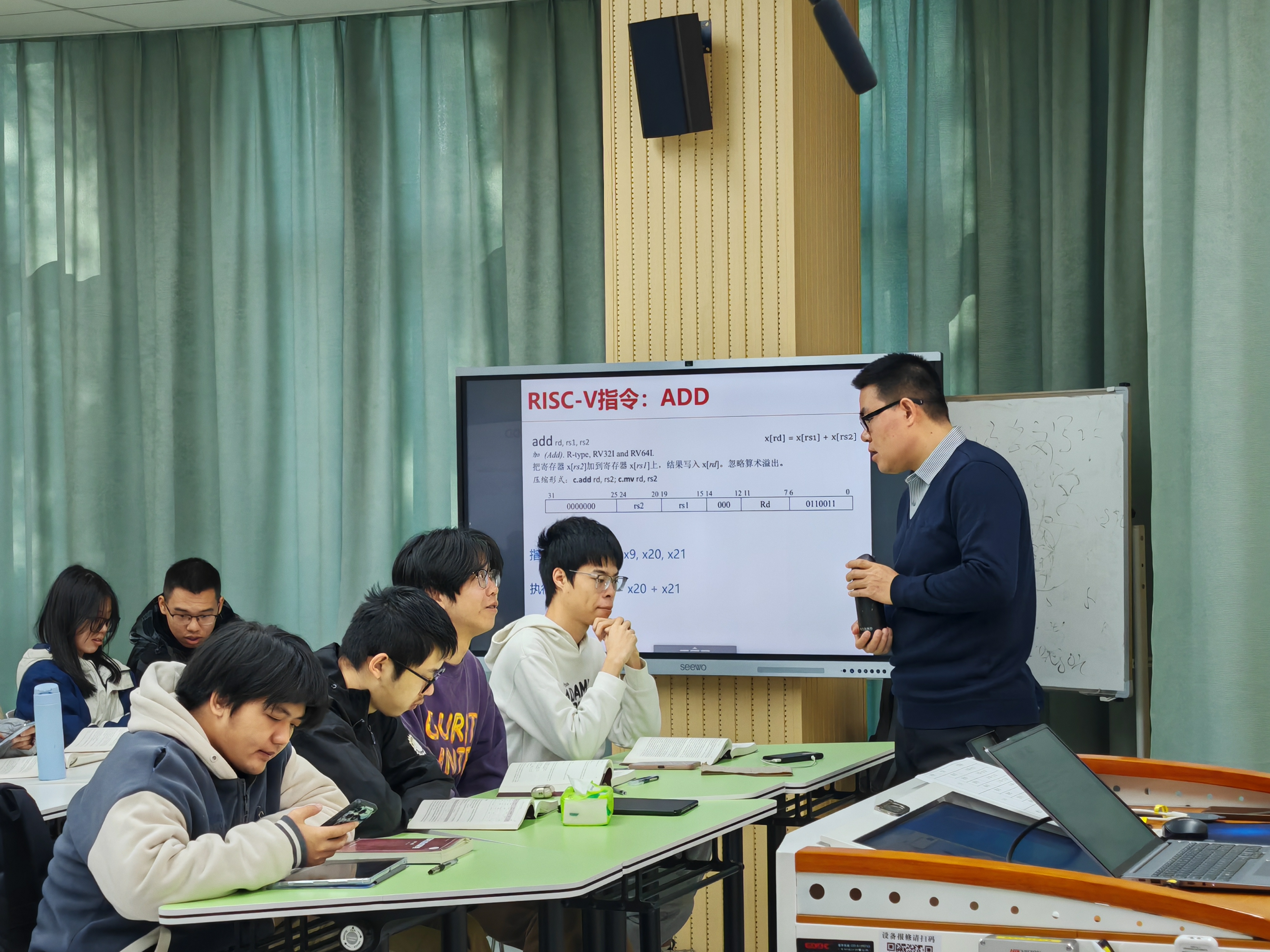 卢老师的授课从计算机的构造谈起,由主板到芯片,进而到芯片的制造流程,最终聚焦于《计算机组成原理》课程的核心——芯片的功能与设计。他详细对比了RISC-V、ARM、MIPS、x86等不同指令集的特点,并以当前芯片产业中备受瞩目的RISC-V指令集为例,深入浅出地讲解了RISC-V指令集的格式,并进一步展开讲解RISC-V指令系统的数据通路设计。在课程中,卢老师还向同学们展示了RISC-V指令运行的仿真平台,以及真实芯片设计中常用的Verilog开发方法。课堂上,卢老师通过鲜活的例子与同学们积极互动,耐心解答疑问,极大地激发了学生们对计算机系统结构的浓厚兴趣,为他们未来的学习奠定了坚实的基础。