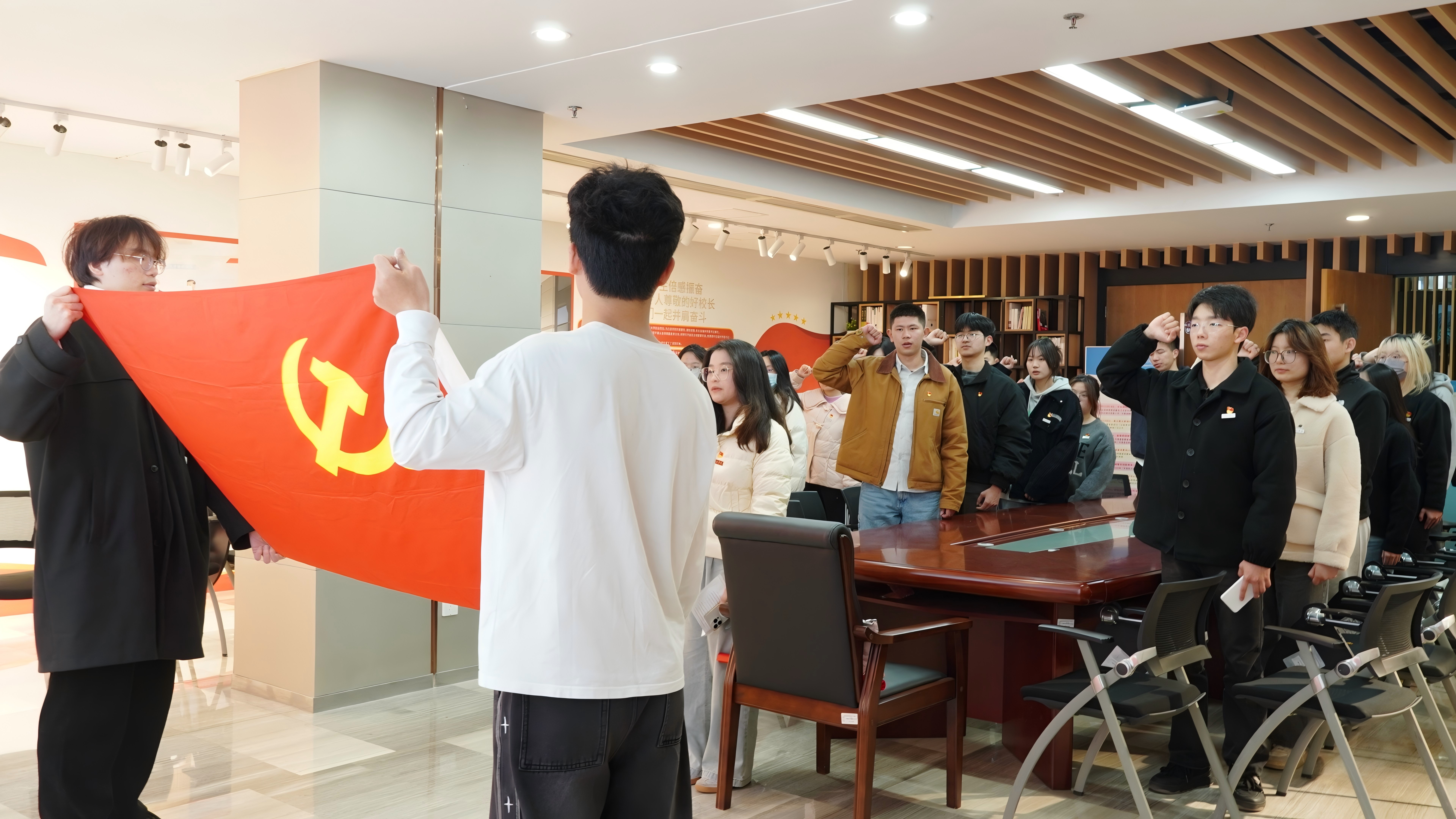 在学习室内,全体党员整齐列队,面向党旗,举起右拳庄严宣誓:“我志愿加入中国共产党……”这激昂的誓言彰显着青年党员传承红色基因、勇担时代使命的坚定信念。通过重温入党誓词的庄严仪式,进一步激励党员们深刻回溯自己的入党初心,时刻以“适应社会需要”为行动指引,在投身社会实践、服务人民群众的不懈奋斗中,努力实现属于自己的人生价值。