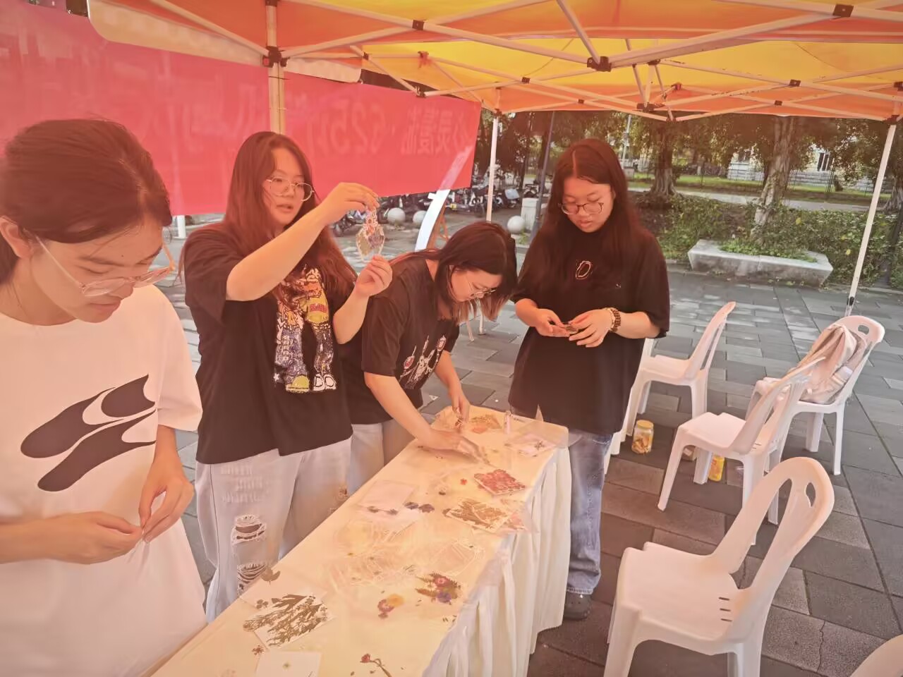 在“自然之语,心灵之花——制作创意书签”活动中,同学们围坐在一张张铺满了透明贴、瓶子和各类配饰的桌子旁,空气中弥漫着淡淡的花香和树叶的清新气息。这里充满了自然的生机与手工的温暖,仿佛是一个可以释放压力、激发创造力的小天地。大家小心翼翼地挑选着自己喜欢的树叶和鲜花,进行简单的处理和组合。然后,用透明贴将这些自然元素固定,制作成独特的书签。在这个过程中,同学们的脸上洋溢着专注与喜悦。随着一个个创意书签的完成,整个活动现场仿佛被温暖的氛围包围。这些小小的书签,不仅承载着同学们的创意和心意,更增添了一份阅读的趣味。