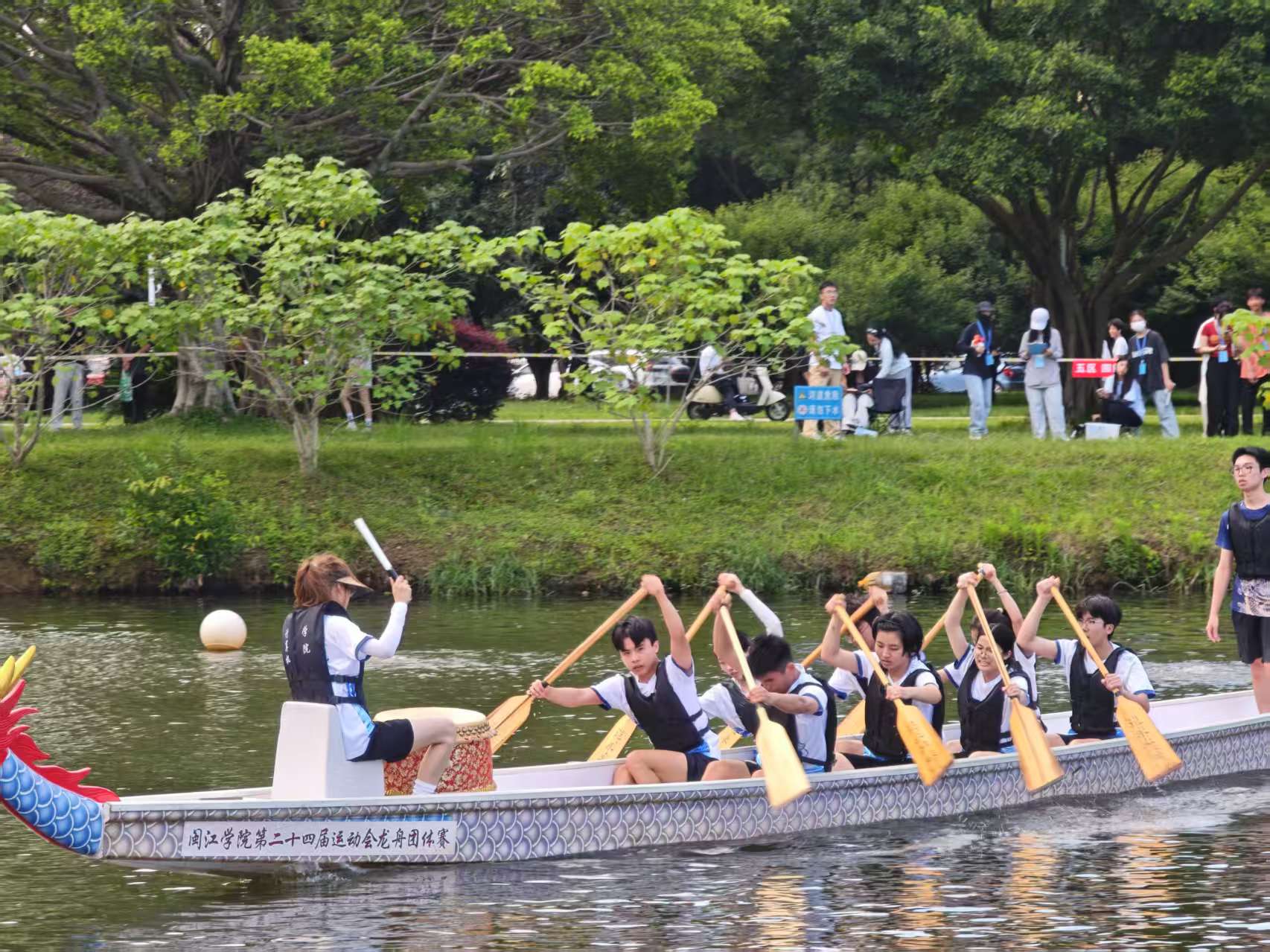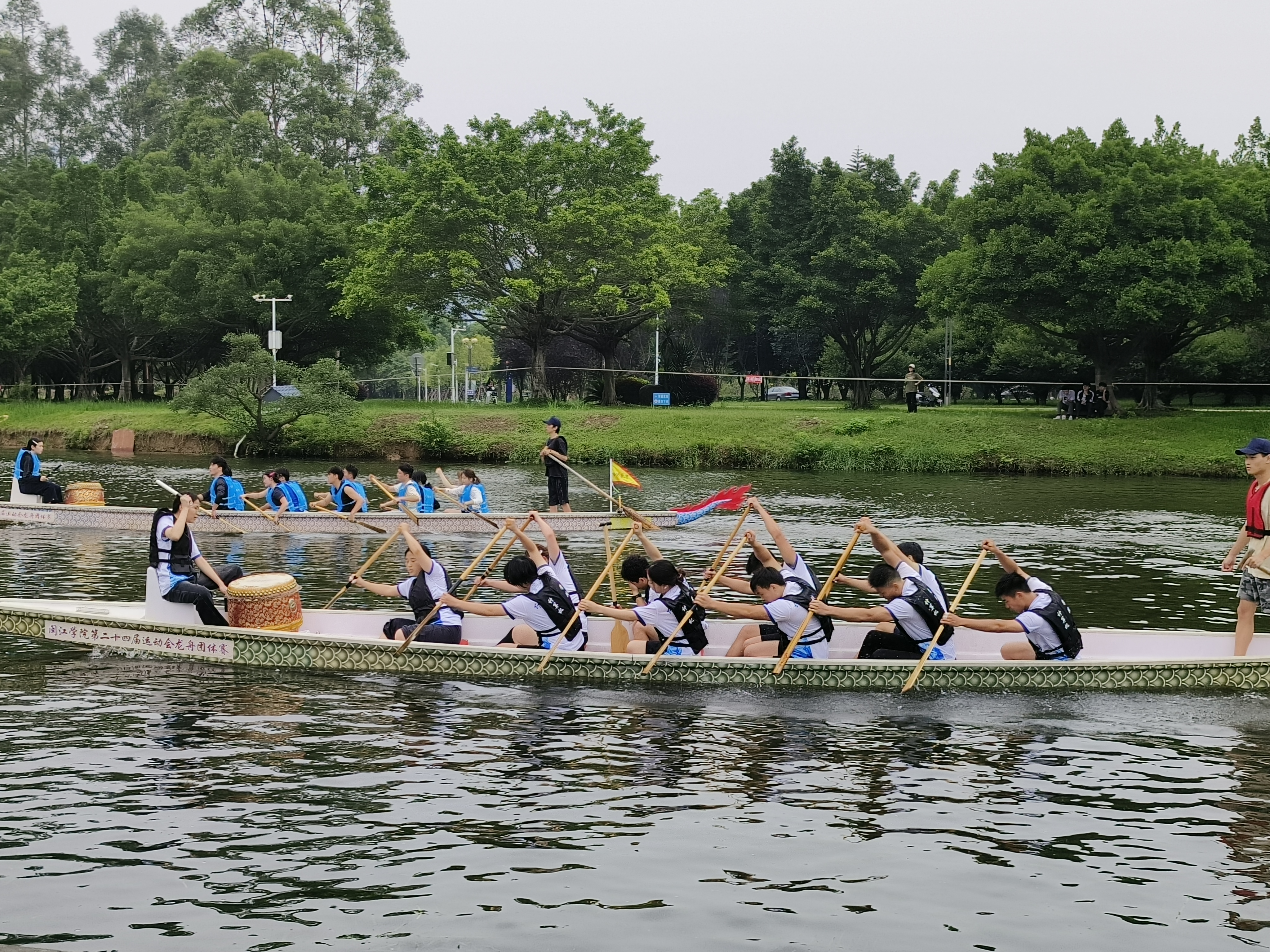 随着一声响亮的发令枪响,比赛正式拉开帷幕。河面上,龙舟你追我赶,竞争异常激烈。我院龙舟队的队员们手臂肌肉紧绷,奋力划动船桨,额头上汗水与河水交融。他们的眼神始终紧盯前方,心无旁骛。河岸两旁,啦啦队的加油声震耳欲聋,“加油!加油!”的呼喊声此起彼伏,似阵阵战鼓,为队员们注入无穷动力。