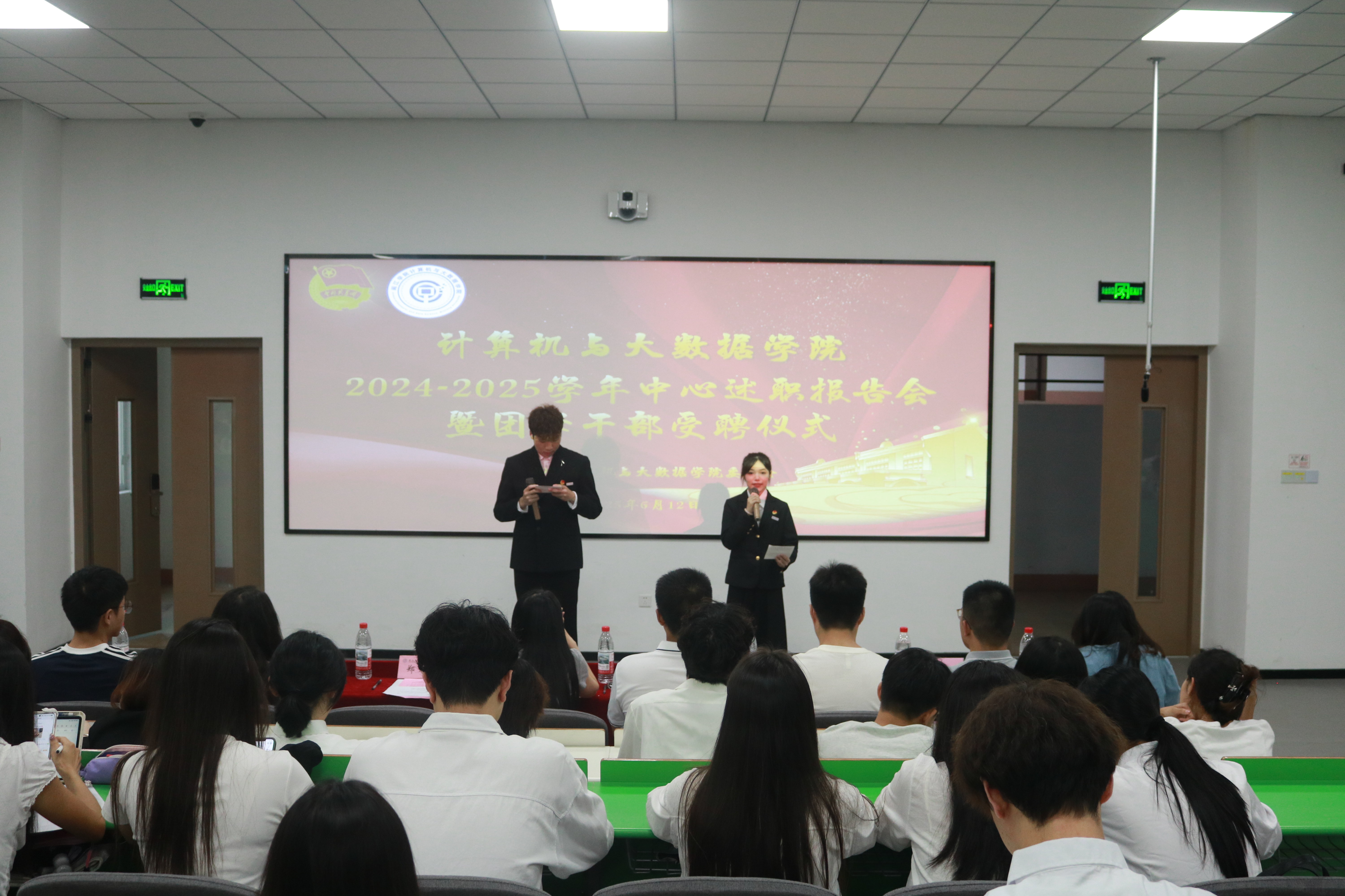 6月12日,百合小说 举行两委中心述职报告会暨团学干部受聘仪式。学院党委副书记侯杰、团委书记姚佳艺、各年级辅导员、全体团学干部参加会议。