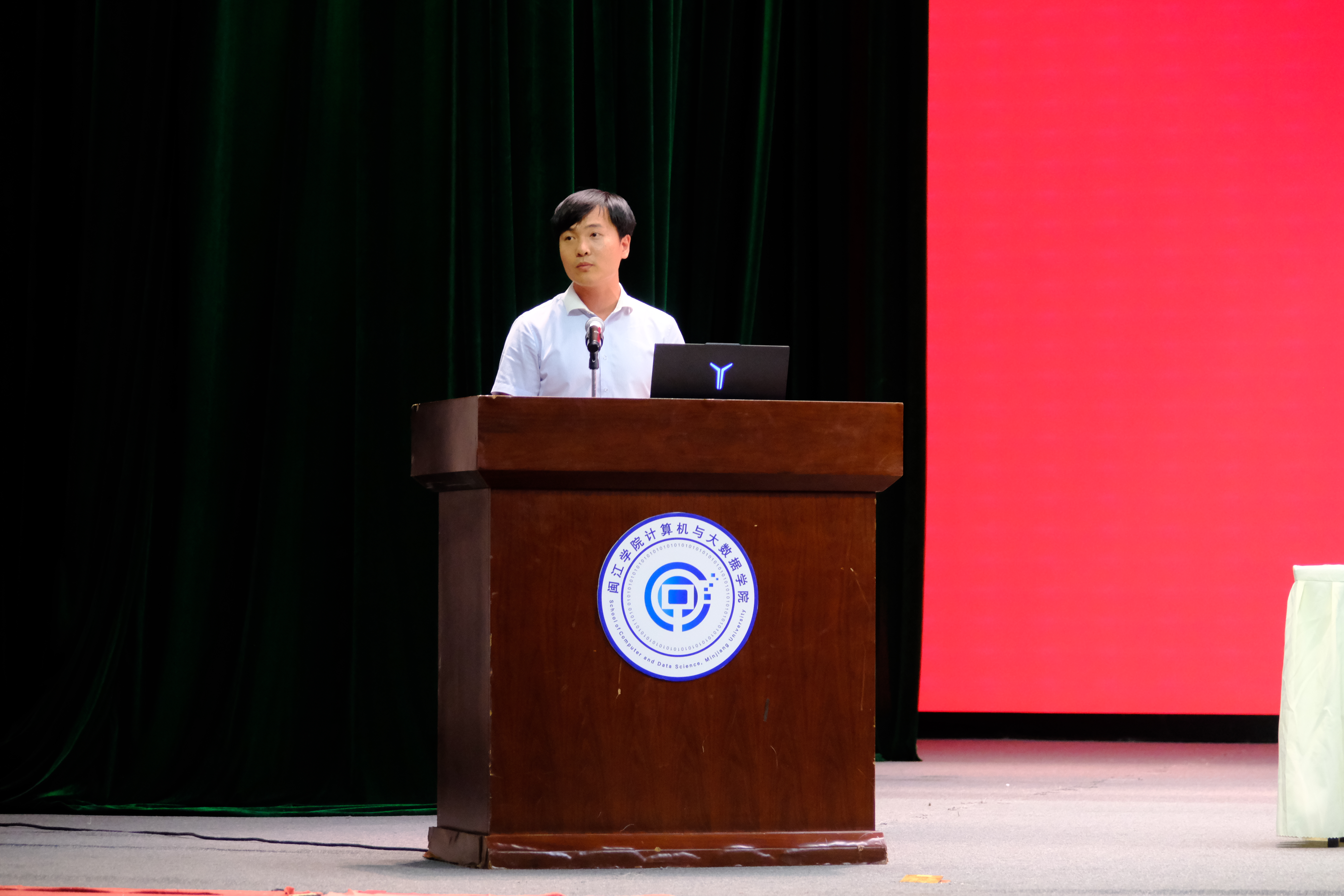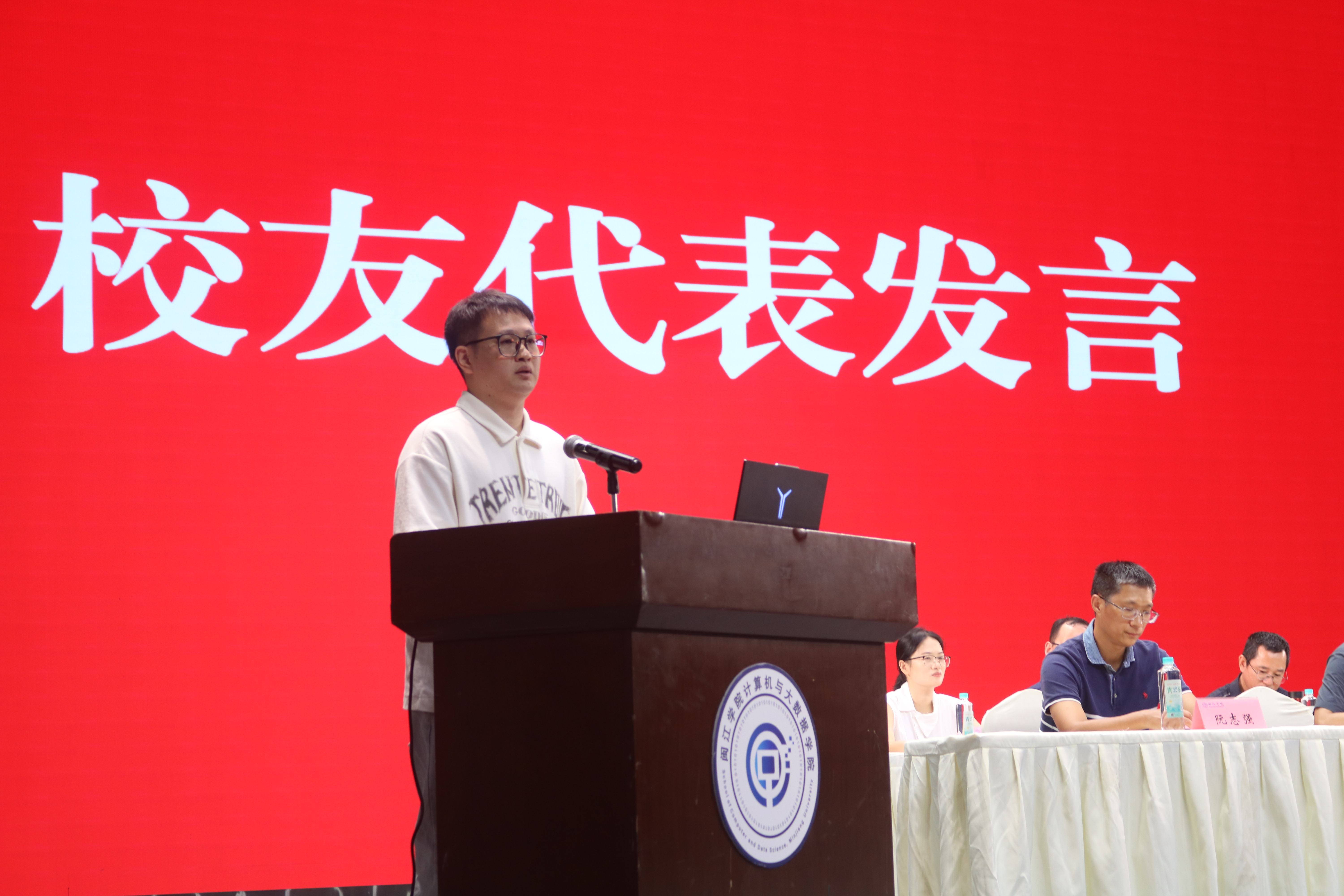 何学智老师作为教师代表发言。他结合自身求学与企业工作经历,向新生提出三点寄语:积极拥抱AI但不依赖AI,保持批判与创造;主动求教于师长,把握成长机遇;从填写梦想开始行动,用代码、实验与实践为简历赋能。他祝愿同学们在闽院新舞台上克服迷茫、收获顿悟,学有所成、前程似锦。