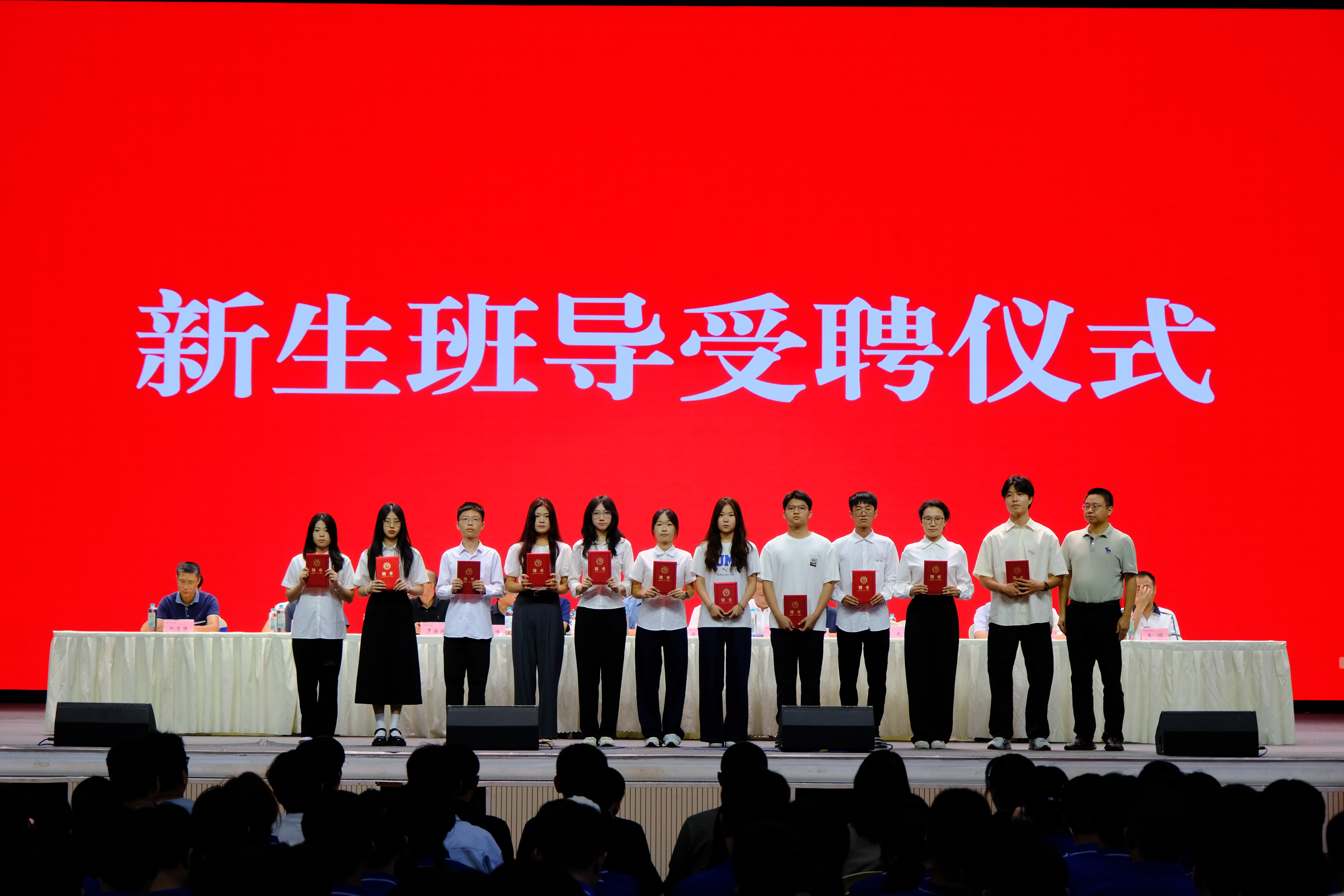 国歌铿锵奏响,开学典礼在雄壮的国歌中拉开序幕。副院长罗海波宣读了新生班主任、新生班导聘任决定。学院党委书记林耿和副院长徐戈分别为新生班主任、新生助导颁发聘书。