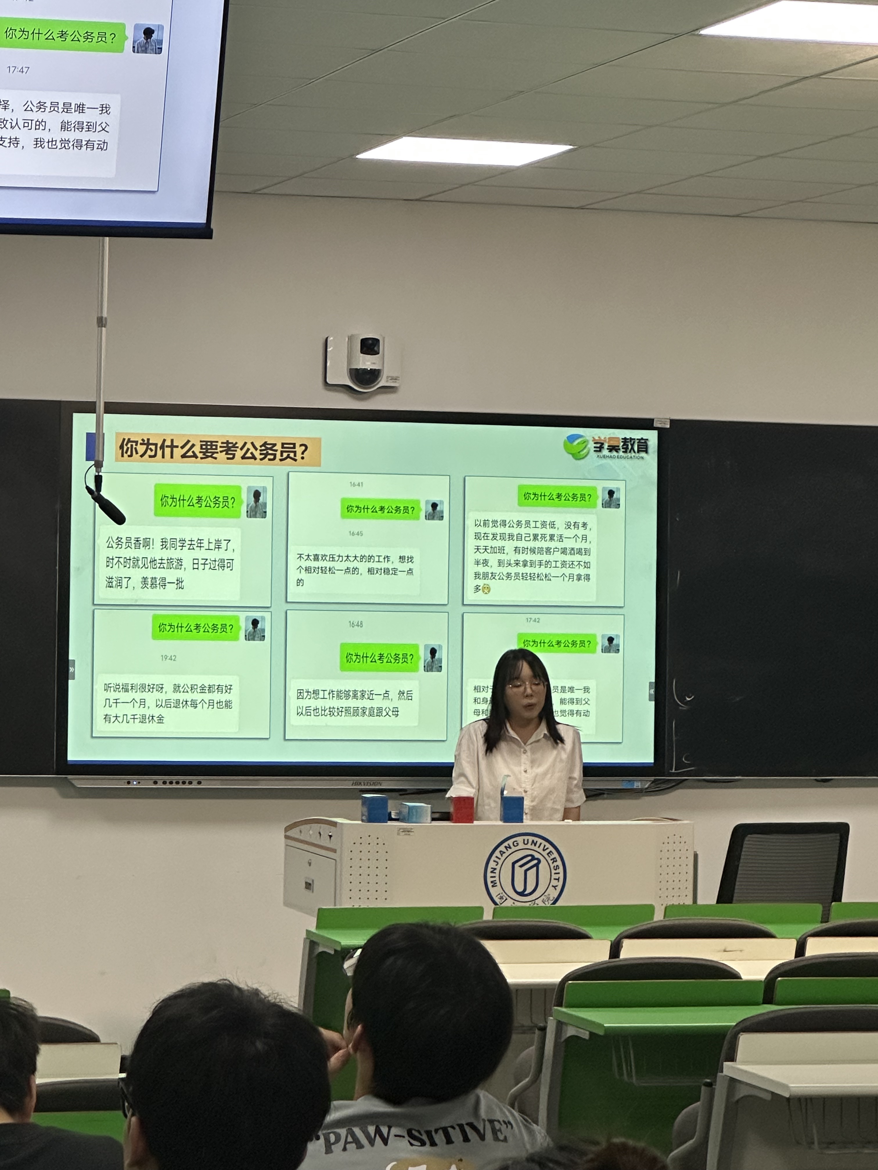 讲座上,平依梦从公职类考试的考情入手,详细介绍了国考、省考、事业单位、选调生考试等多种公职类考试的特点和备考策略。她通过具体的数据和案例,分析了各类考试的招录人数、岗位分布及竞争情况,帮助同学们对考公有了更全面、深入的了解。除了理论知识的讲解,平依梦还结合自身实战经验,分享了诸多实用的备考技巧。她强调了备考心态的重要性,鼓励同学们要保持积极、坚韧的心态,遇到瓶颈时不轻言放弃,主动寻找解决方法。