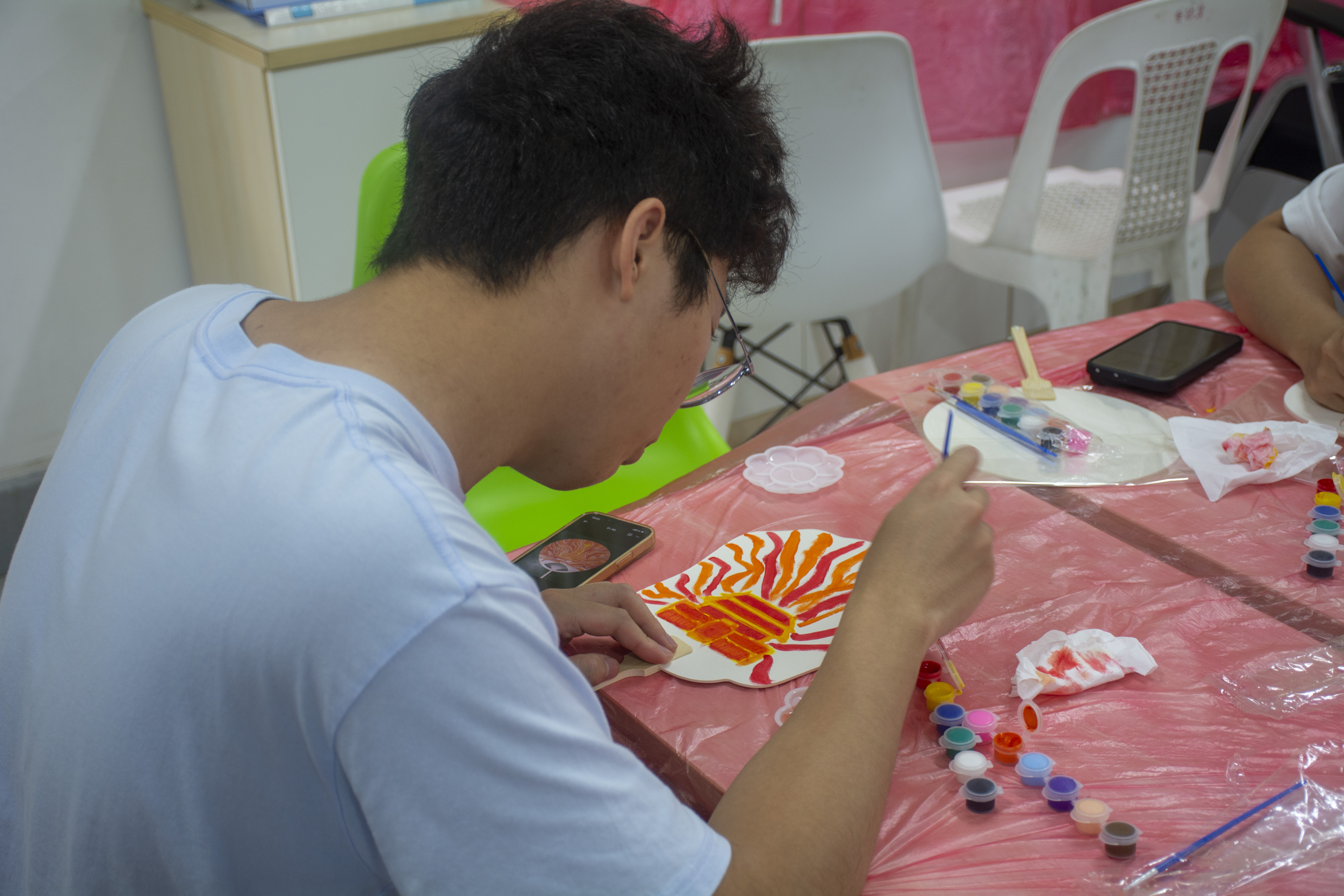 创作过程中,同学们相互交流灵感,用色彩表现家国情怀,原本空白的团扇渐渐成为兼具美感与温度的爱国作品。同学们在制作完成后分享了自己的创作理念,表达了深深的民族自豪感与归属感。