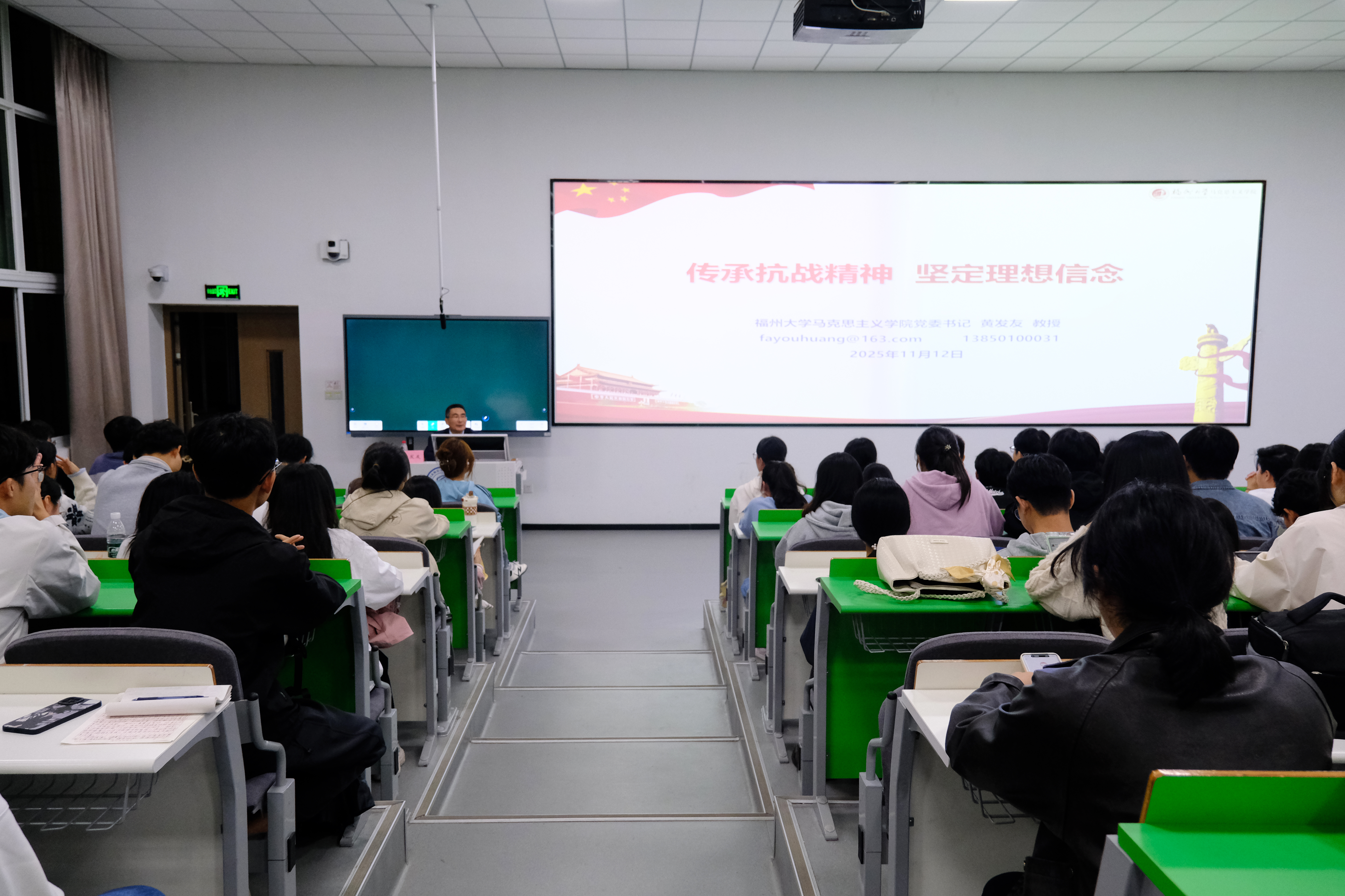 为引导广大青年传承抗战精神,坚定理想信念,从历史中汲取奋进力量,厚植家国情怀,2025年11月12日,百合小说 党委邀请福州大学马克思主义学院党委书记黄发友教授来校开展“传承抗战精神,坚定理想信念”专题讲座。讲座由学院党委组织员郑寒秀主持,学生党员、入党积极分子和“青马工程”培训班学员参加讲座。