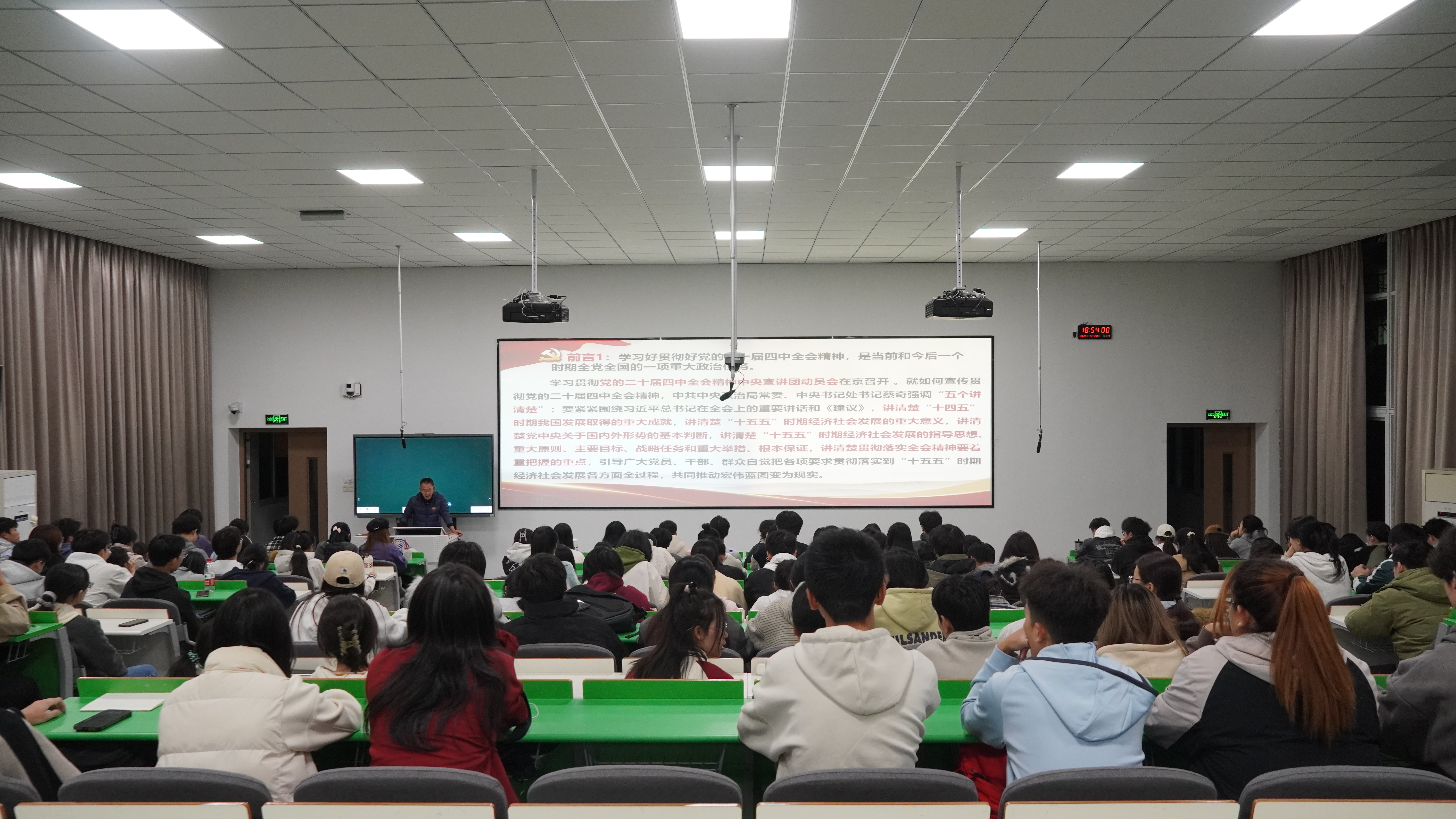 此次专题讲座为青年学子搭建起理论学习与思想提升的优质平台。同学们通过学习,深刻领会党的二十届四中全会的核心要义,精准把握“十五五”规划的时代定位与实践逻辑,在思想交流碰撞中进一步坚定理想信念、明晰奋斗方向。大家纷纷表示,将以全会精神为根本指引,紧扣个人专业所长与国家战略需求,在科技创新、数字赋能等关键领域刻苦钻研、苦练本领,在强国建设、民族复兴的壮阔征程上挺膺担当,用实干笃行书写无愧于时代、无愧于青春的精彩答卷。