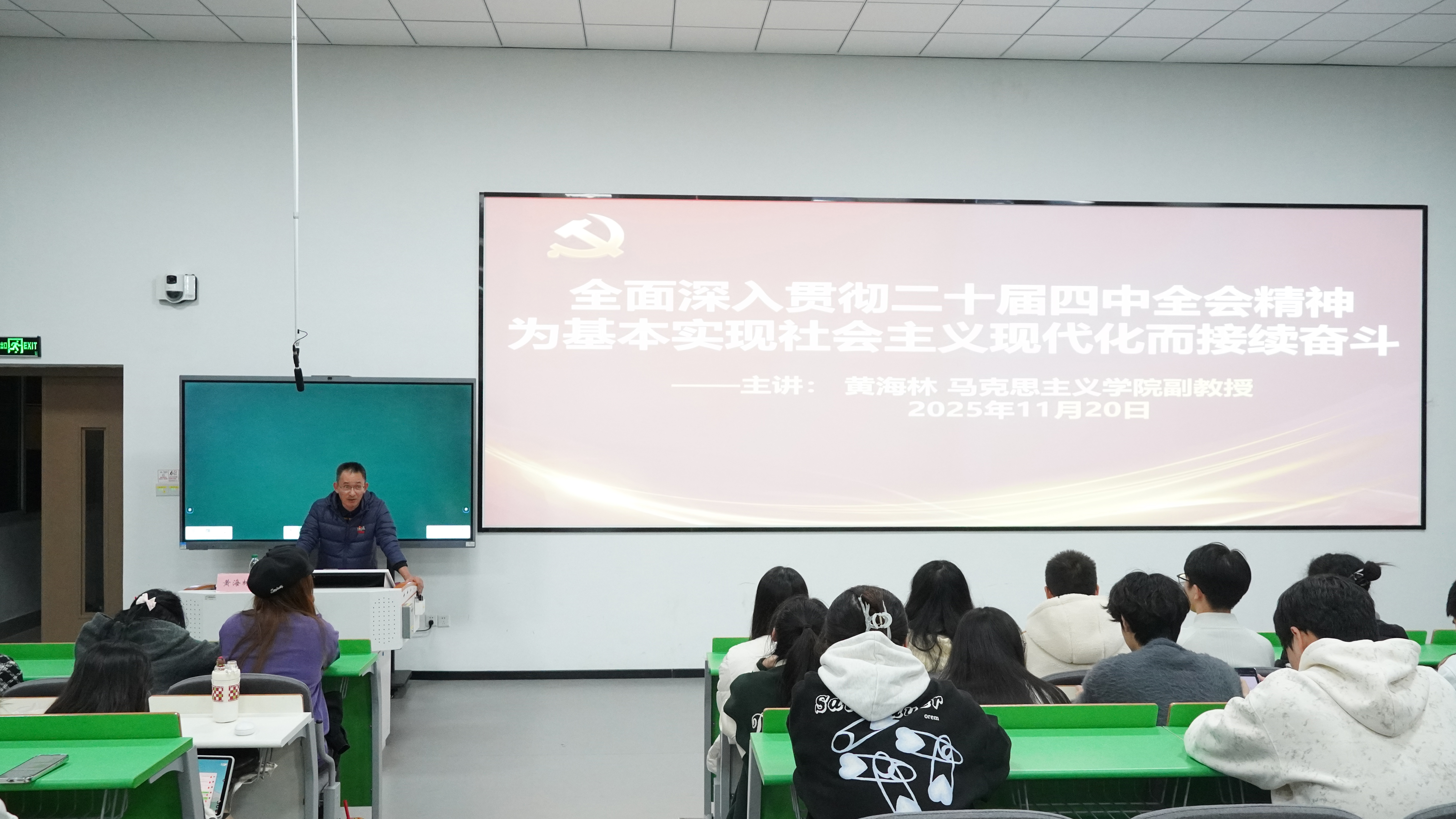 讲座尾声,黄海林副教授以“全党全国各族人民要更加紧密地团结在以习近平同志为核心的党中央周围,为基本实现社会主义现代化而共同奋斗”作总结,鼓励在场青年要深刻领会全会精神实质,将其转化为担当作为的实际行动,以青春之力扛起时代重任,在推进中国式现代化的新征程中续写属于青年一代的奋斗篇章。