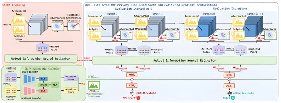 在联邦学习(Federated Learning)中,对抗训练(Adversarial Training, AT)常被用于增强模型抵抗对抗性扰动的鲁棒性。然而,对抗性梯度往往更容易受到梯度反转攻击(Gradient Inversion Attacks, GIAs)的威胁。尽管差分隐私对抗训练(DP-AT)能在一定程度上保护隐私,但由于现有的静态隐私评估方法(如基于攻击的模拟)计算量极其庞大,难以在动态训练中实时量化梯度的隐私风险。为了突破这一局限性,本文提出了 PLR-Gate,一个新颖的用于实时评估梯度隐私风险并实现门控梯度传输的框架。该框架包含两个核心机制:首先,在进行 DP-AT 之前,模型会在模拟梯度行为的策略分布上训练一个互信息神经估计器(Mutual Information Neural Estimator, MINE),从而实现对梯度与原始训练图像之间互信息(Mutual Information, MI)的实时估算;其次,基于估算出的互信息,本文定义了一个统一的“隐私泄露率(Privacy Leakage Ratio, PLR)”指标来量化隐私风险。在 DP-AT 训练期间,PLR-Gate 会执行门控机制,仅有当估算的 PLR 值满足安全阈值时,才会选择性地将该梯度传输至中央服务器,从而确保联邦学习中梯度聚合的安全性与自适应性。大量实验证明,本文提出的 PLR 指标不仅能够有效量化梯度反转的风险,更在计算效率上取得了突破性进展。