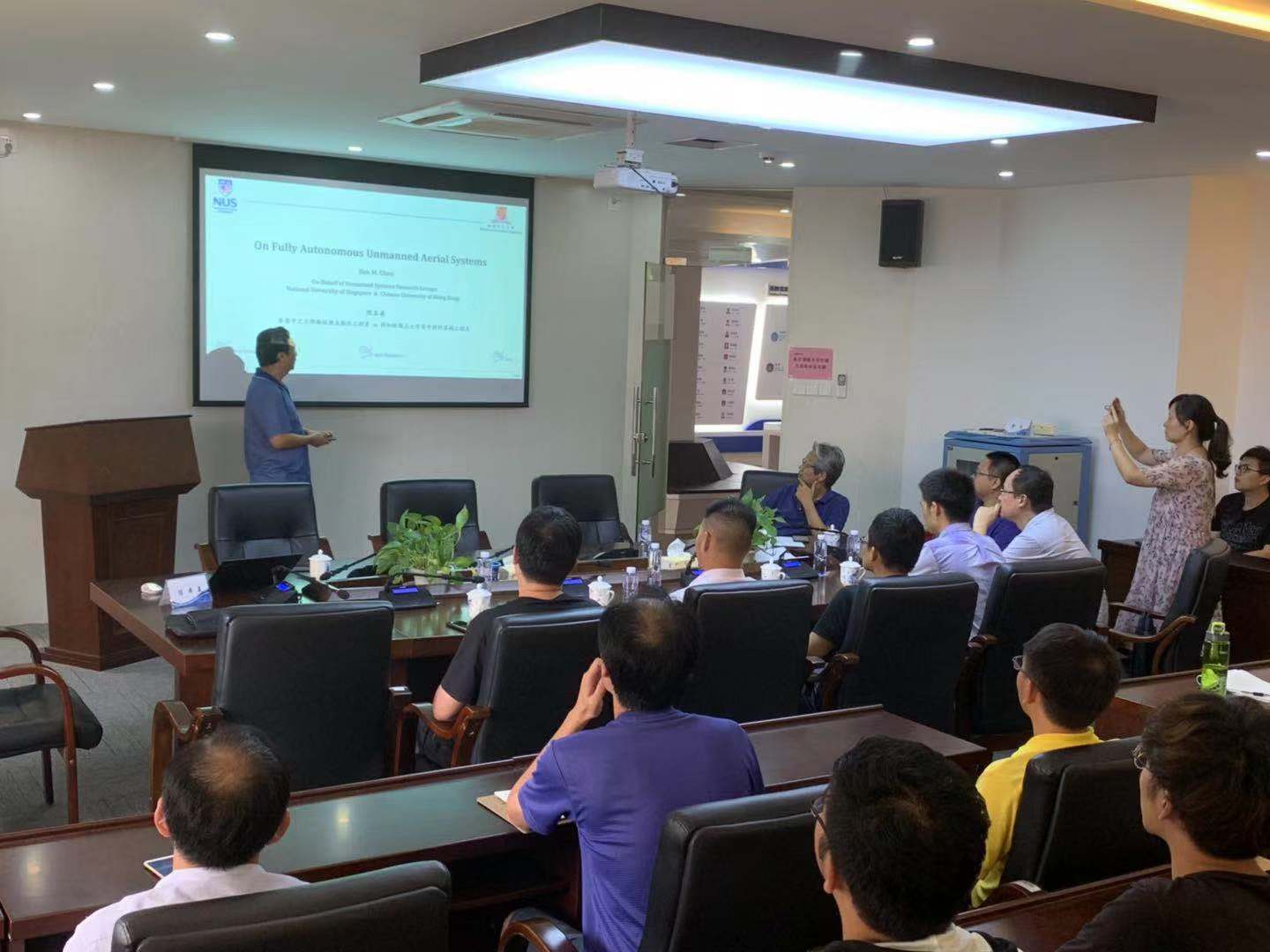 陈本美教授主要介绍了新加坡国立大学和香港中文大学的团队小组关于无人系统研究的最新进展。研究的主题包括多传感器数据融合,实时同步定位和映射,未知环境中的动态路径规划以及智能任务规划和管理。讲座中,陈本美教授用了丰富的团队项目案例结合生动的演示视频,以其渊博的学识、精辟的分析让大家受益匪浅。在互动环节中,老师和同学们踊跃发言,陈本美教授一一做出详细的解答。会后同学们激动的表示陈本美教授讲座非常精彩,让大家学到了很多分析问题,解决问题的方法。