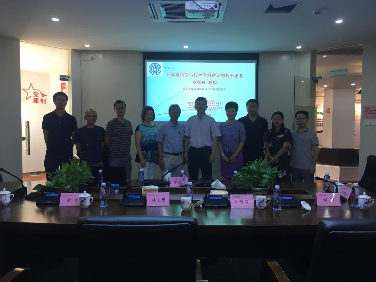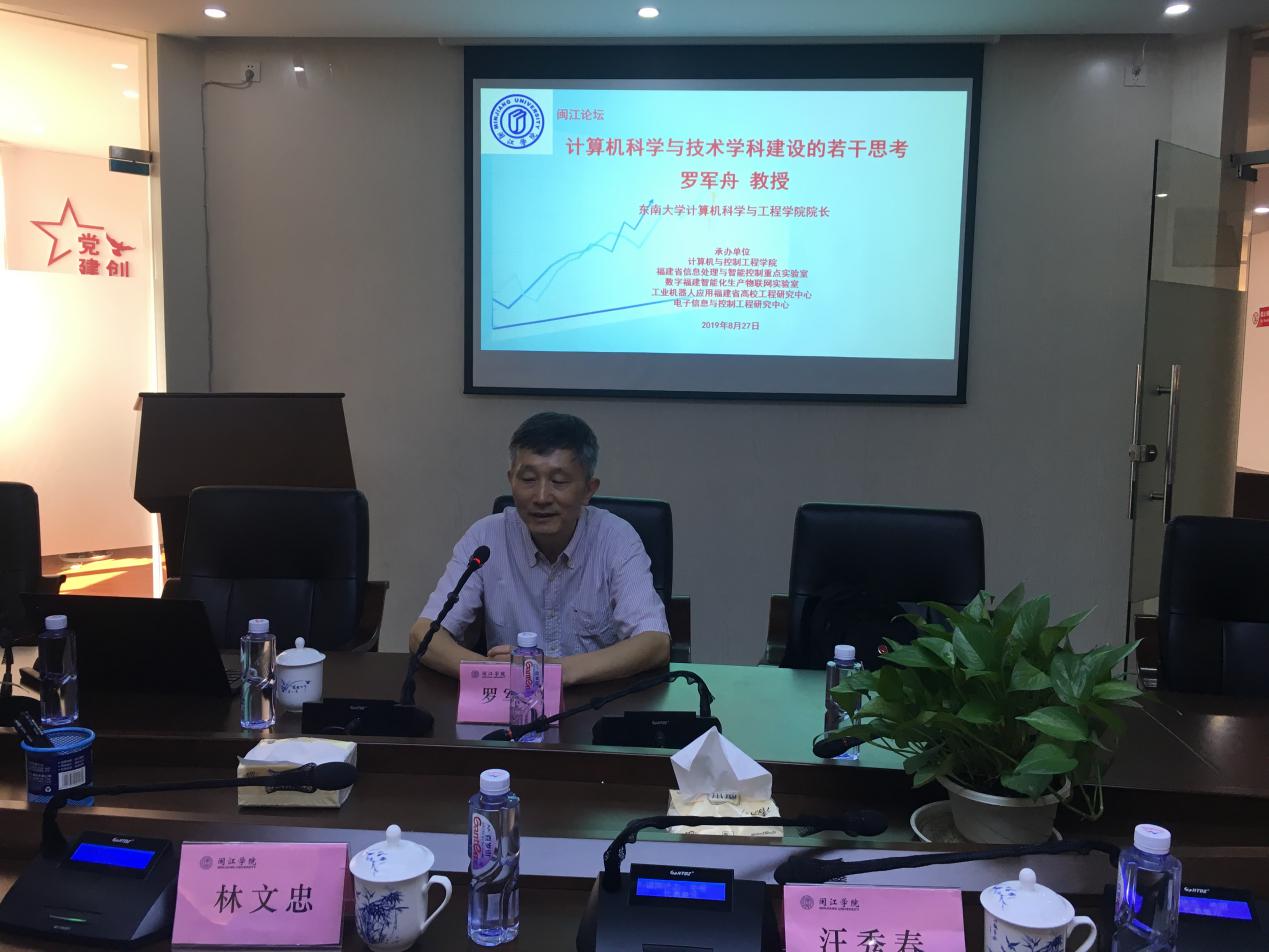 2019年8月27日上午,东南大学计算机科学与工程学院院长罗军舟教授应邀莅校交流讲学,主题为“计算机科学与技术学科建设的若干思考”。交流报告会由计控学院院长林文忠教授主持,党委书记汪秀春,党委副书记张颖,副院长徐戈、吴景岚及各专任教师参加了本次讲座。
